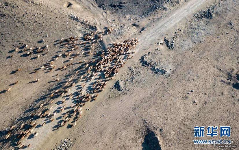 4月17日,新疆福海县牧民赶着牲畜在山谷间穿行(无人机照片)。新华社记者 顾煜 摄