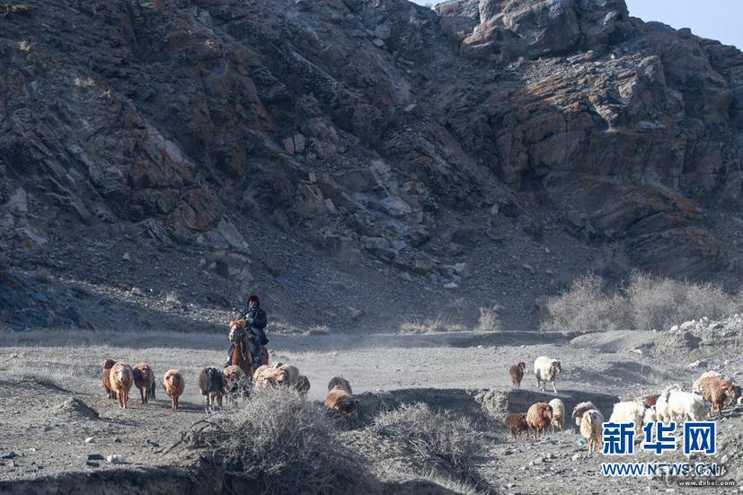 4月17日,新疆福海县牧民赶着羊群穿行在山谷间,向春秋牧场进发。新华社记者 马锴 摄