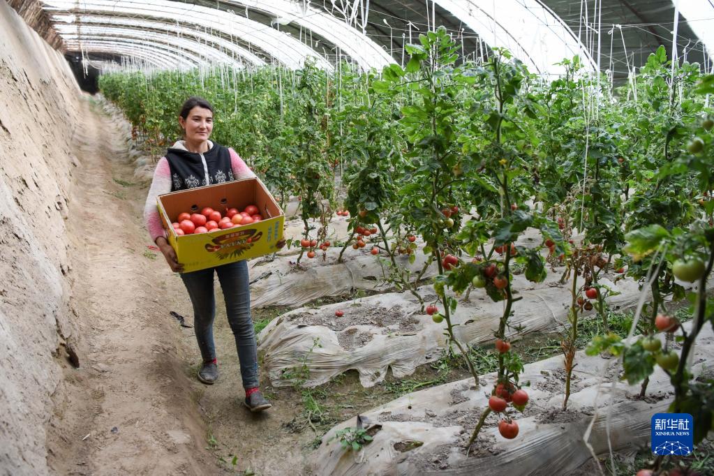 在新疆莎车县伊什库力乡设施农业基地,种植户搬运刚采摘的西红柿(2020年3月18日摄)。该设施农业基地是在上海援疆莎车分指挥部协调推动下建立的。新华社记者丁磊摄