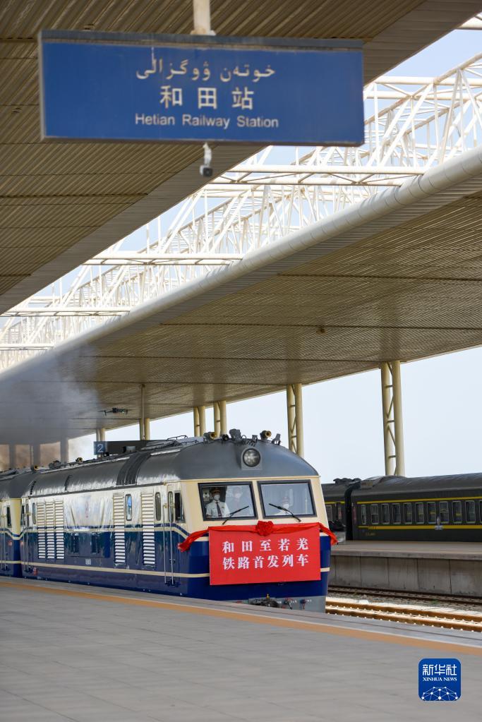 和田至若羌铁路首趟列车驶出新疆和田火车站(2022年6月16日摄)。新华社记者丁磊摄