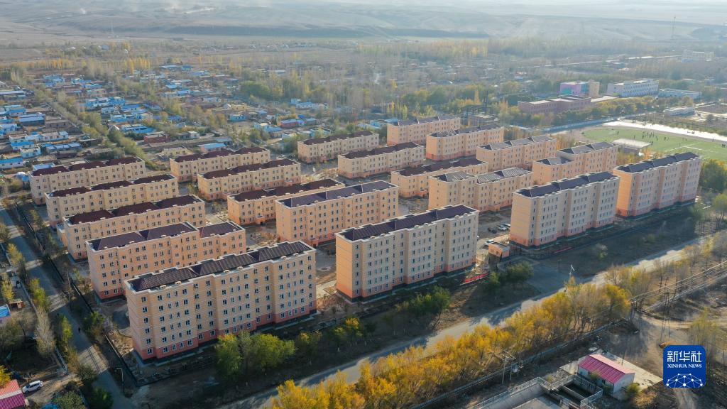 这是新疆昌吉市阿什里乡天鹅小镇(无人机照片,2020年10月16日摄)。天鹅小镇是由福建援疆泉州分指挥部支援建设的牧民定居项目。新华社记者丁磊摄