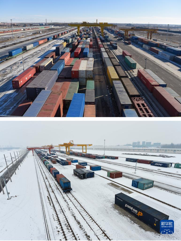 拼版照片:上图为2021年2月6日拍摄的新疆霍尔果斯铁路口岸换装场内的换装作业场景(新华社记者丁磊摄);下图为2013年12月25日拍摄的新疆霍尔果斯火车站换装场(新华社记者江文耀摄)。新华社发