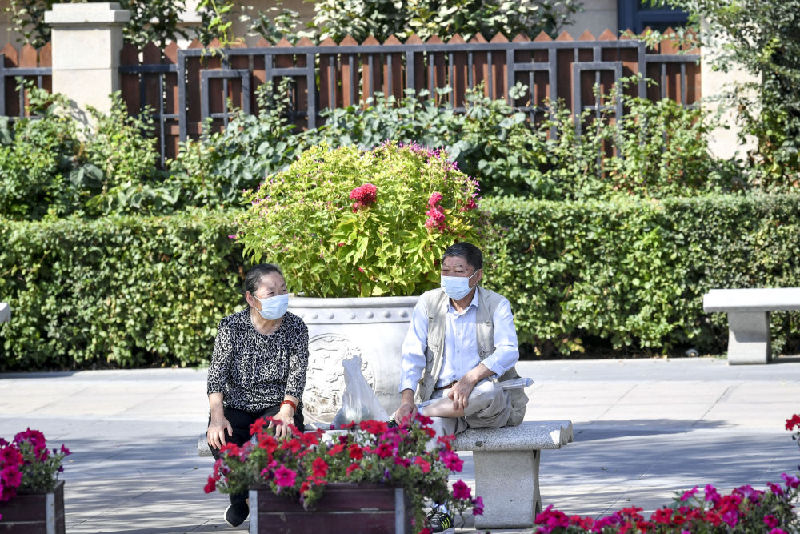 8月31日,乌鲁木齐市南湖北路街道南湖北路东社区居民在室外休闲。(新华社记者马锴摄)