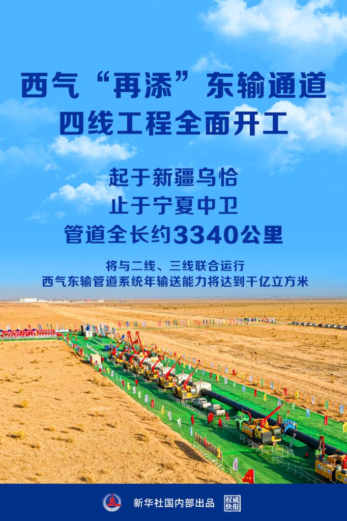 新华社北京9月28日电(记者戴小河)国家管网集团西气东输四线工程28日正式开工,工程起于新疆乌恰县,止于宁夏中卫市,管道全长约3340公里。