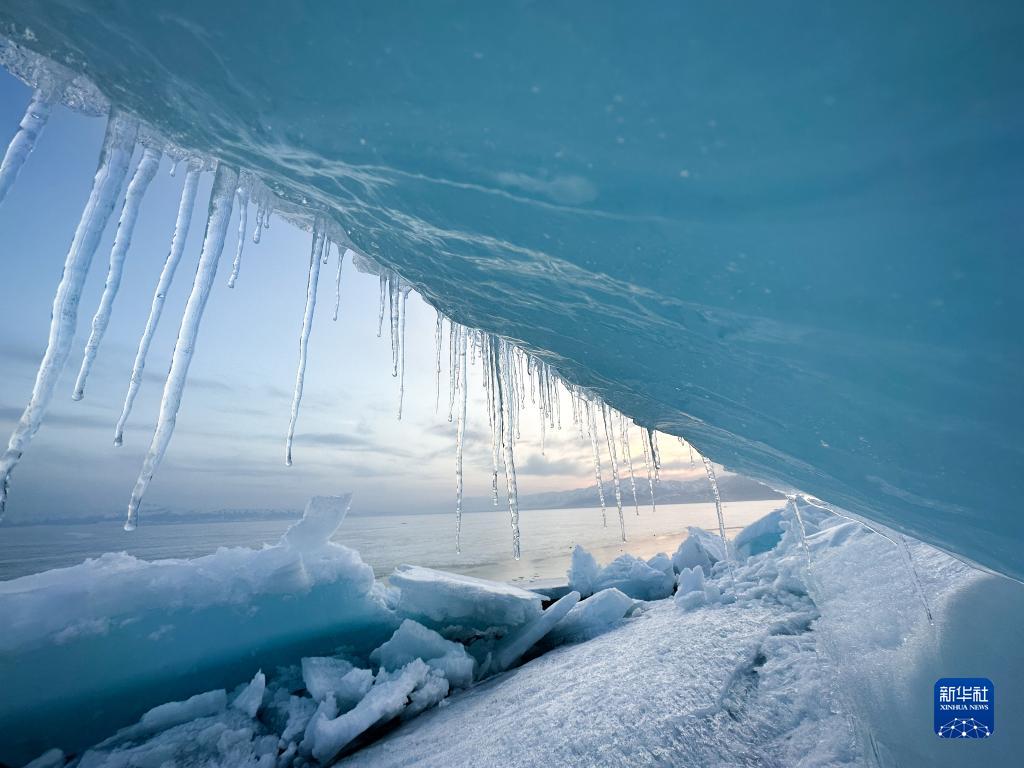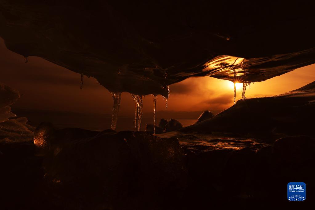 4月6日拍摄的黄昏时赛里木湖畔的冰推。