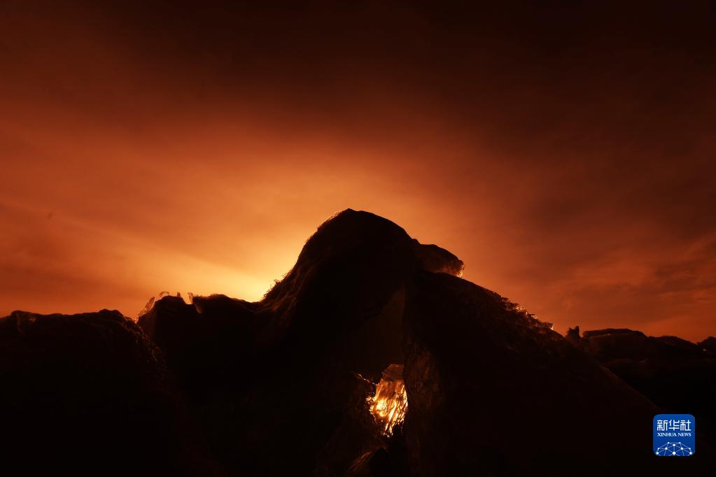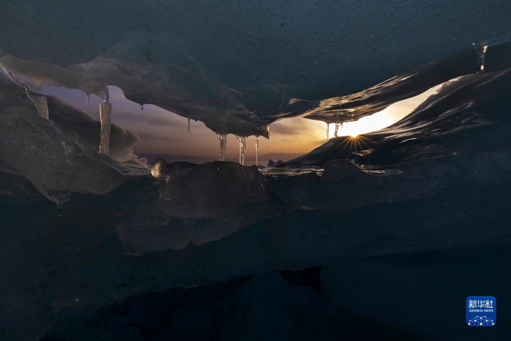 4月6日,赛里木湖畔的冰推在夕阳下散发着光芒。