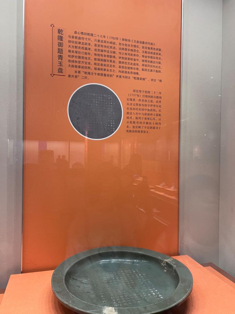 新疆维吾尔自治区博物馆“故宫厅”首展展出的“乾隆御题青玉盘”。新华社记者周晔摄