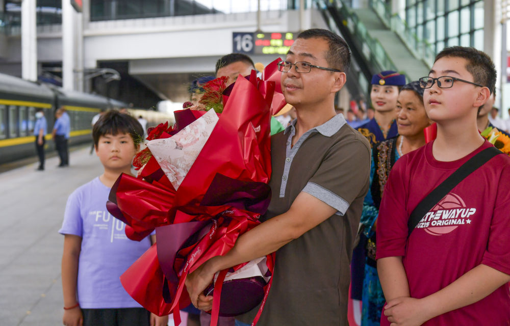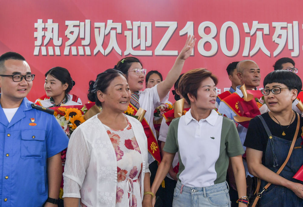 8月7日,在乌鲁木齐站,Z180次列车乘务人员家属迎接亲人归来。新华社记者 王菲 摄