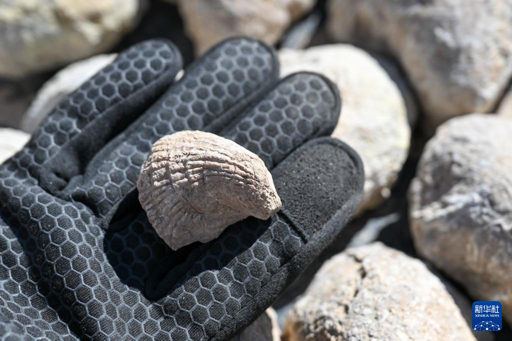 在新疆克孜勒苏柯尔克孜自治州乌恰县古海遗址贝壳山,专家学者在查看贝壳化石(10月25日摄)。