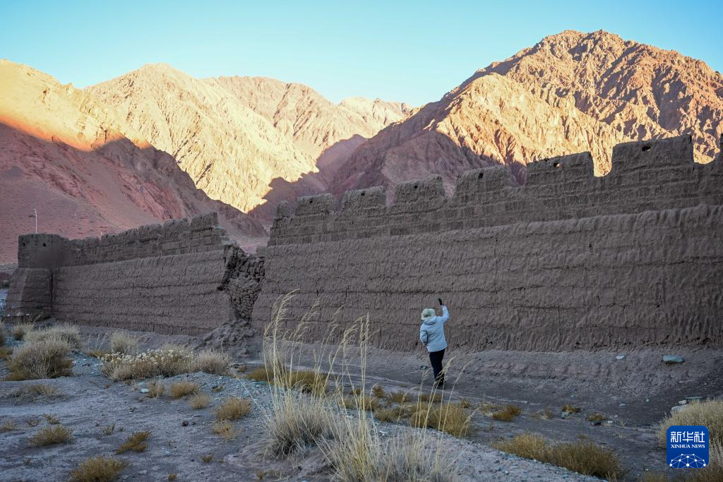 在新疆克孜勒苏柯尔克孜自治州阿克陶县木吉乡,“巡礼中国西极 跨越昆仑天山”多学科科考队队员用手机拍摄穆呼老营房遗址(10月21日摄)。