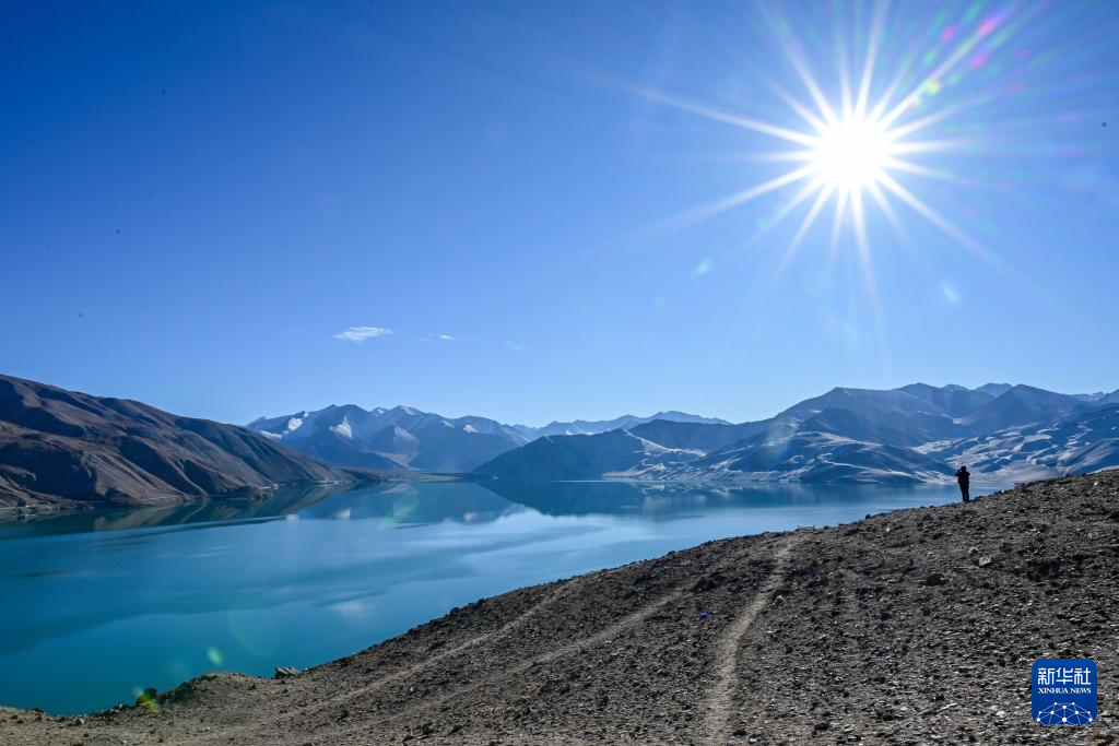 在新疆克孜勒苏柯尔克孜自治州阿克陶县,多学科科考队员在拍摄白沙湖(10月19日摄)。