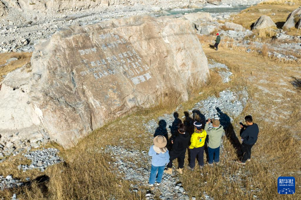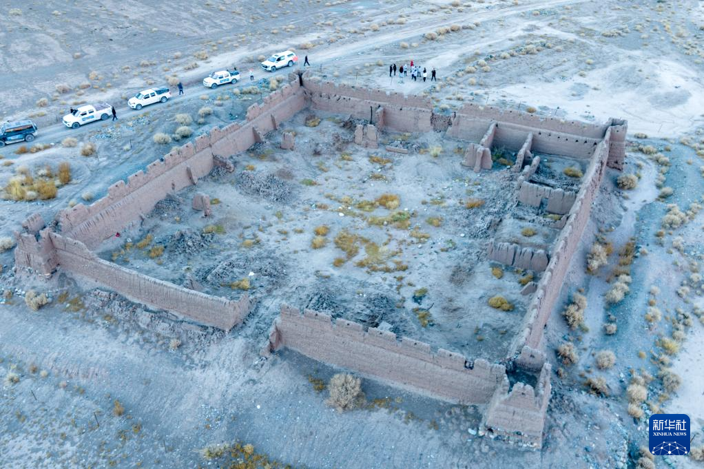 在新疆克孜勒苏柯尔克孜自治州阿克陶县布伦口乡,专家学者考察盖孜古驿站(10月19日摄,无人机照片)。