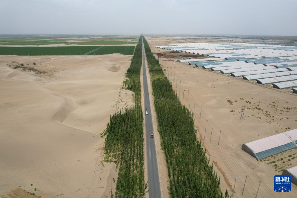 在新疆和田地区和田县拍摄的防护林带,道路两边是沙漠饲草基地和设施农业基地(6月20日摄,无人机照片)。新华社记者 丁磊 摄
