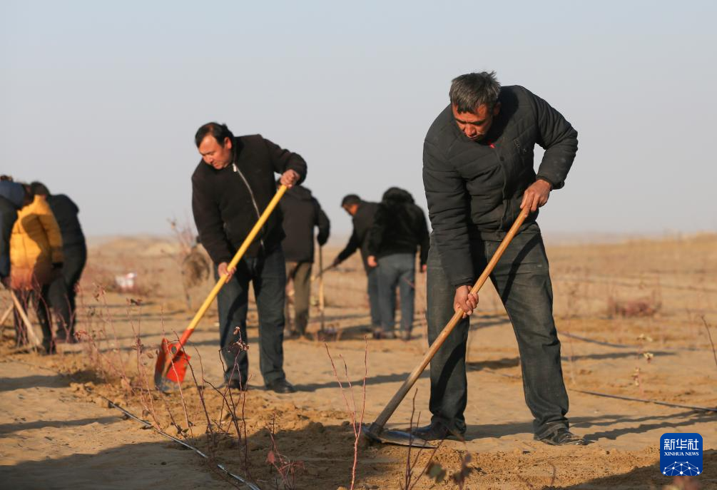 11月28日,在新疆于田县万花园防沙治沙示范区,各族干部群众加紧栽种玫瑰花苗。新华社发(许晓龙摄)