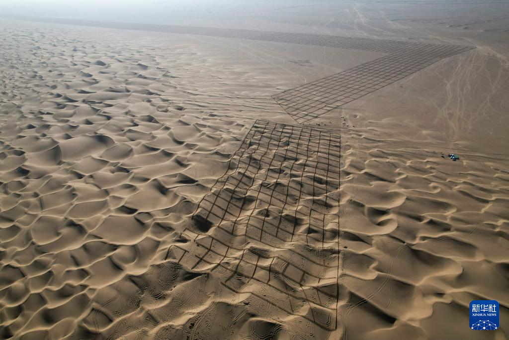 11月27日,在新疆和田地区皮山县科克铁热克镇至叶城县方向沙漠“锁边”空白区,施工人员在搭建高立式沙障(无人机照片)。新华社发(邹懿摄)