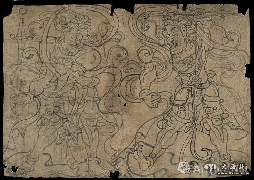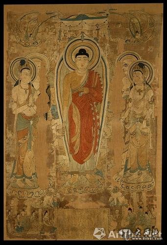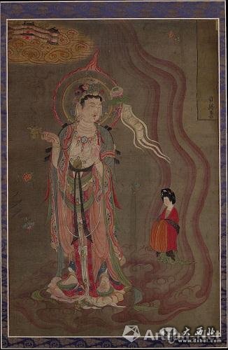 来自法国收藏的敦煌藏经洞瑰宝包括《观音经变图卷》,以横卷连环故事画的形式,讲述《妙法莲华经》第25品《观世音菩萨普门品》中,观世音菩萨以神通力救济诸般苦难,又游诸国土,以三十三现身度化众生的故事。此卷为法国著名汉学家和探险家伯希和(Paul Pelliot)于1908年从敦煌带走,现藏于法国国家图书馆。另一件同样由伯希和带回法国的绢画珍品为吉美国立亚洲艺术博物馆典藏的《观音经变》,画笔细腻、色彩亮丽、布局清晰、保存完好,是唐代敦煌绢画中十分珍贵的作品之一,也是少有的男相观音像。