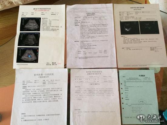 刘永伟展示他在不同医院做的六次检查的诊断结果。