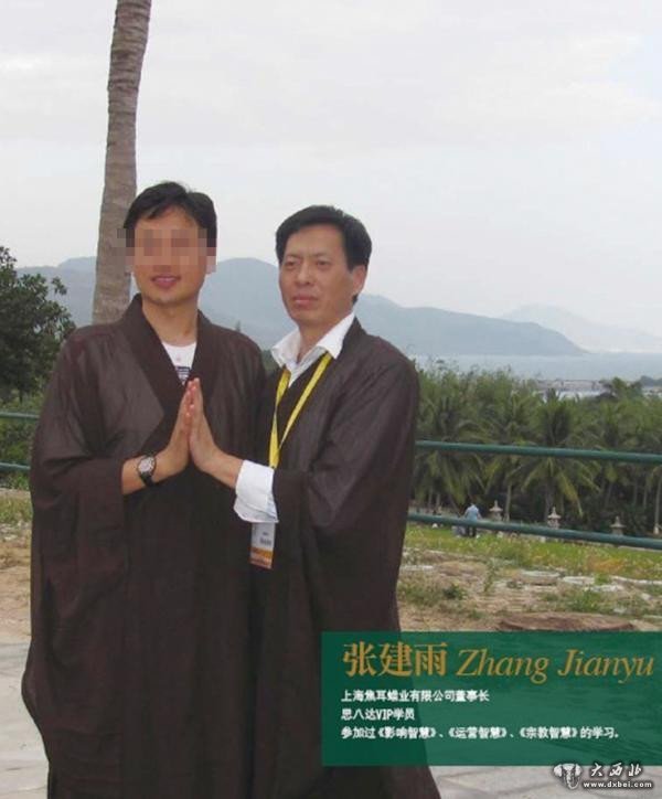 一家叫“思八达”的“商业智慧传播机构”官网显示,张建雨是这家公司的VIP学员,参与过《影响智慧》、《运营智慧》、《宗教智慧》课程的学习。在一张图片中,身份标明为上海焦耳蜡业有限公司董事长的张建雨身着道袍似的服饰,与“思八达”创始人相互簇拥,击掌合影。张建雨还撰写了课后感。他在文章中称,如果早一点参加这个课程,那么上海焦耳蜡业“会比现在强大100倍”。