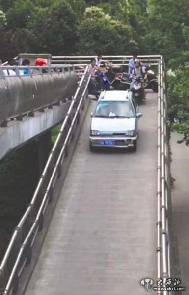 记者从赵先生拍摄的视频中看到,奥拓车行驶到三环路外侧时,在极窄的转弯处多次打盘转换方向,当电瓶车正常上桥时,被奥拓车堵住无法通行,经过多次转换方向,奥拓车终于行驶下人行天桥。赵先生说,司机是一名大约20多岁的年轻小伙,车从上桥到下桥大约花了十几分钟,当车辆行驶在桥上时,现场许多市民也在声讨:“人行天桥,汽车咋个乱开上来,不守交通规则。”