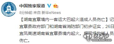 记者26日从现场目击者、湖南省宜章县政府部门和湖南省消防部门初步证实,26日上午,一辆客运大巴车行驶到宜凤高速湖南省宜章县境内起火。据现场救援人员向记者证实,事故已造成人员伤亡。