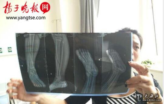 此时,欣欣因为脚被缠住,小腿已呈扭曲状。商场管理人员和曾女士连忙将孩子送到附近的盐城市三院治疗。扬子晚报记者看到了欣欣的检查报告,上面显示右内踝骨折,右踝关节软组织肿胀;右胫骨中下段骨折;右足第5跖骨近端骨小梁模糊。