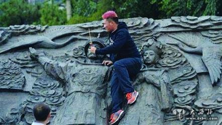 6日中午,沈阳故宫南侧两座巨型铜质浮雕群附近嬉闹声一片,两三米高的浮雕墙顶端拍照人群涌动,有全家来的,也有情侣,还有带着自拍杆的。有的游客自创情景,拿吃剩的糖葫芦“喂”清帝雕像;有的非要在帝后之间做出拆散两人的举动。有个五六岁的小女孩在妈妈怂恿下爬上最顶端,看着都让人捏一把汗。