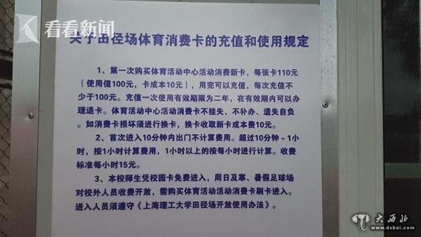 上海理工大学近日贴出告示规定,原先免费对外开放的田径场要开始对外收费了。收费标准是采用充值卡模式,每张卡110元,进入操场10分钟以上,就要按照每小时15元的标准收费。此项举措引起很多家住附近锻炼者的不满。