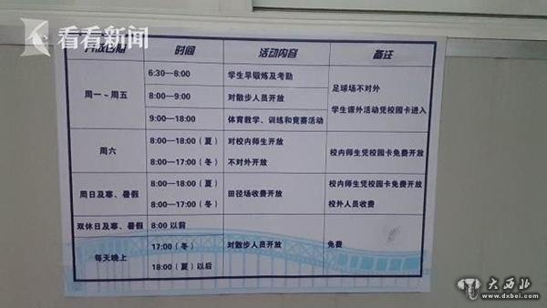 时先生说,早在2006年,上海市教委、体育等多部门就曾颁布指导意见,要求包括高校在内的操场、田径跑道等,安排适当时段向社区居民免费开放。可从11月开始,上海理工大学贴出告示规定,每周一至周五8点到9点,冬季17点后,夏季18点后,外校人员才能免费进入田径场,其它时段则因有教学活动,不对外开放。时先生认为,操场为教学服务,这种做法无可厚非,可是公告上又写明,周日及寒暑假白天,学校田径场对外收费开放,这就让人觉得不太合理了。