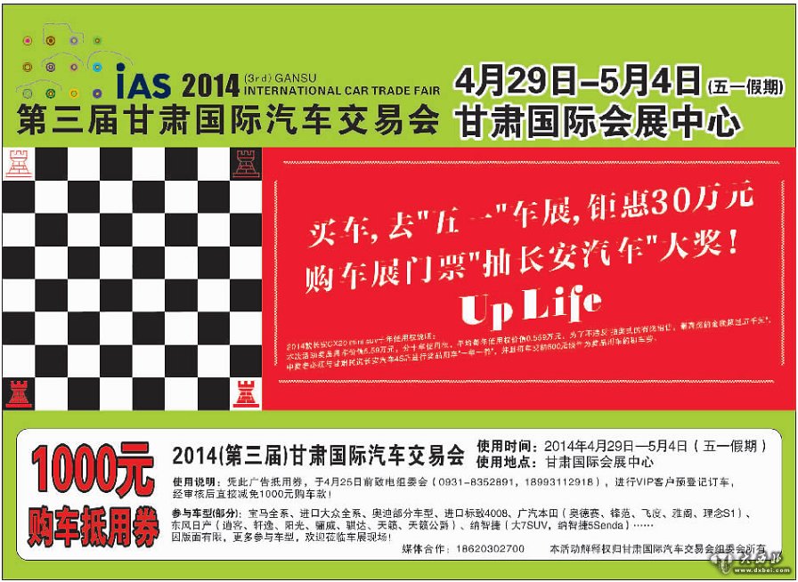 据悉,“2014(第三届)甘肃国际汽车交易会”将于4月29日—5月4日(星期二—星期日)在甘肃国际会展中心隆重举行,本届车展以“UpLife,引领汽车生活”为主题,将继续启用甘肃国际会展中心一楼、二楼全部8个展馆及室外展区,展会规模达到5万多平方米,以创新、互动的汽车文化主题活动;专业、细致的现场服务,为汽车消费者带来全新的活动体验和实实在在的购车优惠。