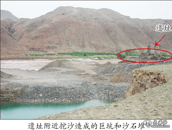 今年7月,一伙非法淘沙采金人员在索桥堡附近黄河边作业,擅自对索桥堡内部分街道和古道进行拓宽,给索桥堡外侧至桥墩遗址一带地貌造成严重破坏。其中,古道被破坏40米,街道破坏面积8平方米。为了让重型机械通过,不法分子不惜开挖道路,将索桥堡所在的台地挖去数米,导致临近依然矗立的石墙岌岌可危。长达一个月的挖沙活动在长城保护范围内形成了一个宽几十米、深达数米的大水坑。一旁的高处,淘金人员所遗留的塑料袋、塑料桶等比比皆是。记者在现场看到,索桥长城墙体被开挖出宽3米、高2.5米的豁口,豁口剖面上重型机械留下的铲痕清晰可辨,豁口两边的墙体顶端各有一处坍塌,坍塌处两侧均有重型机械翻越的痕迹。经专家现场勘验,不法分子对长城上原有的豁口进行了扩大,在重型机械依然无法通过的情况下,径直沿土坡翻越长城,导致长城墙体部分被压塌。专家发现,索桥长城另一处墙体因开挖水渠形成了一条宽约2.5米、高约0.7米的豁口,不法分子对原本与长城平行的一条浅冲沟进行大规模改造,墙体南侧亦开挖有一条水渠,与墙体豁口相接,对长城墙体及其南侧地貌造成严重破坏。