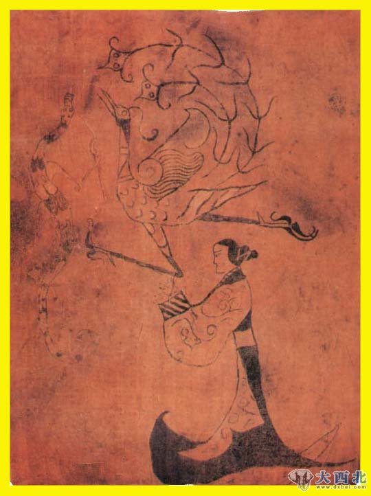 1949年2月在湖南省长沙市陈家大山楚墓出土。四周均为毛边,是当时用以“引魂升天”的铭旌,占画面主要位置的仕女,侧身而立,面向左方,细腰长袍,衣长曳地,下摆向前后分张,衣上饰卷曲的云纹图案。仕女脑后挽垂髻,两手向前伸出,合掌作揖。仕女头上,左前面飞翔着一只凤鸟,头向上,两翅上张,两脚一前曲一后伸,似在振翼奋起。鸟的前面有一龙,势若扶摇直上,全画的主题是祈求飞腾的龙凤引导墓主人的灵魂早日登天升仙。
