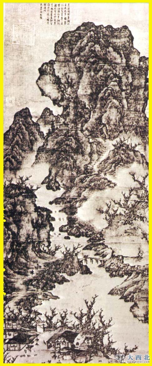 此图上画峰峦高耸,气势雄伟;中画深谷坛林,中藏古寺;近写板桥茅店,旅客往来,商贾停骖,维以寒林鸡犬,富有生活气息。布境兼“高远”与“平远”两法,树木有技无干,用笔简劲老辣,有粗细断续之分;落墨则渍染生动,饶于墨韵。《宣和画谱》称关仝“尤善作秋山寒林,与其村居野渡,幽人逸士,渔市山泽,使见者如在灞桥风雪中,三峡闻猿时,不复有市朝抗尘走俗状。”所述画外之情,亦可与图中约见之。此画无款,据收传印玺,可知先后为贾似道,元内府,明内府,明晋王府及清安岐收藏,后入清宫。《墨缘汇观》及《石渠宝笈续编》等画书著录,可以认为是代表关仝画风之作。