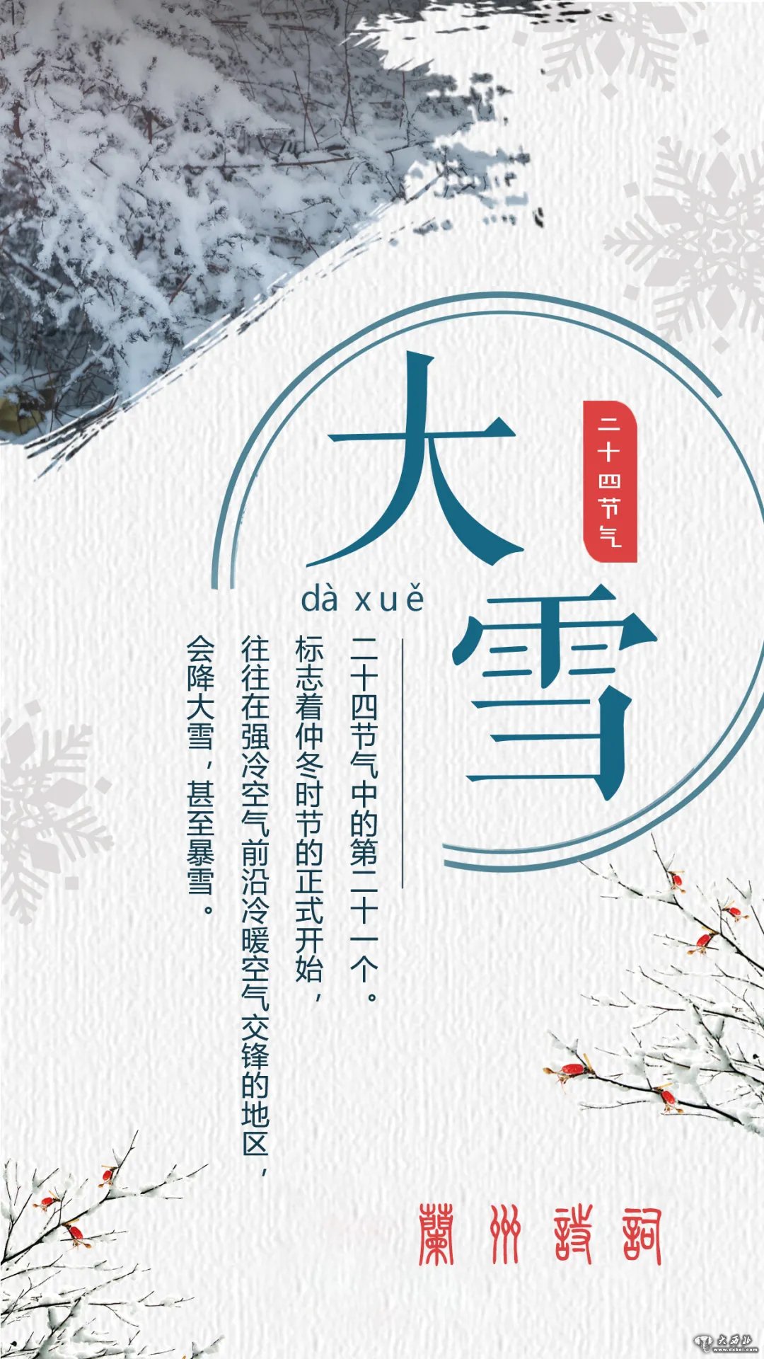 题记——节气是指二十四个时节和气候,是中国古代订立的一种用来指导农事的补充历法,是中华民族劳动人民长期经验的积累成果和智慧的结晶。中国古代农业需要严格了解太阳运行情况,农事完全根据太阳进行,所以在历法中又加入单独反映太阳运行周期的“二十四节气”,用作确定闰月的标准。24节气分别为:立春、雨水、惊蛰、春分、清明、谷雨、立夏、小满、芒种、夏至、小暑、大暑、立秋、处暑、白露、秋分、寒露、霜降、立冬、小雪、大雪、冬至、小寒、大寒2016年11月30日,中国“二十四节气”被正式列入联合国教科文组织人类非物质文化遗产代表作名录。二十四节气作为指导农事的历法,是先民在长期在实践中观察大自然总结出的科学规律,是劳动人民的智慧结晶,是中华民族优秀文化的重要组成部分。随着城市化进程和农业产业化的发展,虽然有了更先进的手段解决农事问题,但二十四节气仍然作为重要的科学参考依据和重要的农耕文化绵延赓续,是中华民族的身份标志,是国家和民族历史创造的集体记忆与精神寄托。“大雪天时记年少,新蔬根蓏未登盘”;“仓庚昨归候,阳鸟今去时”;“藜杖侵寒露,蓬门启曙烟”……古人们通过文学作品书写了节气和不同地域人们生产生活的状态,作为我们了解历史研究历史的重要史料和文学艺术。中华传统文化精髓的传承,是我们义不容辞的责任。传承传统文化的同时应以创新精神弘扬中华传统文化,今天兰州诗词将踏上“二十四节气诗词之旅”,让我们回望历史,用诗词描绘二十节气和我们今天的生产生活,用时代情怀记录历史变迁。适逢大雪节气就从大雪启程,将最美的诗词给最美的节令。是为记。