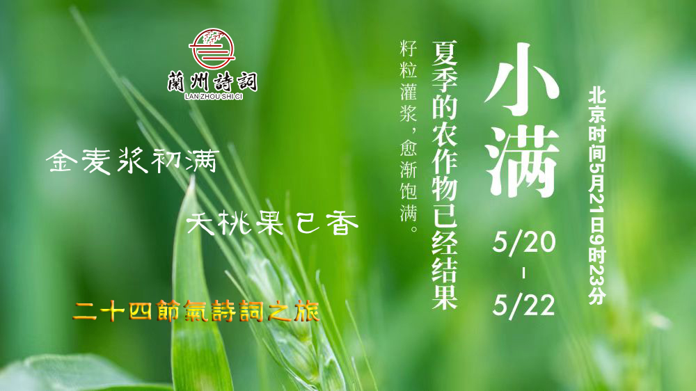 小满,二十四节气中第八个节气,夏季第二个节气。每年5月20日到22日之间太阳到达黄经60°时为小满。小满后,天气渐渐由暖变热,并且降水也会逐渐增多,民谚有"小满大满江河满"的说法。小满,标志着炎夏登场。物至于此,小得盈满:麦类等夏熟作物籽粒饱满但未成熟,故称小满。对于北方地区而言,小满往往是二十四个节气中日照时间最长的,"给点儿阳光就灿烂",加上空气干燥,北方一些地方的气温很容易超越南方。小满有三候,一候苦菜秀,二候靡草死,三候麦秋至。“夜莺啼绿柳,皓月醒长空。最爱垄头麦,迎风笑落红。”这是宋代诗人欧阳修的五绝《小满》生动刻画了小满时节的景象。那么我们当代诗人笔下的小满又是什么样子呢?且看《兰州诗词二十四节气之旅》给您精彩呈现——