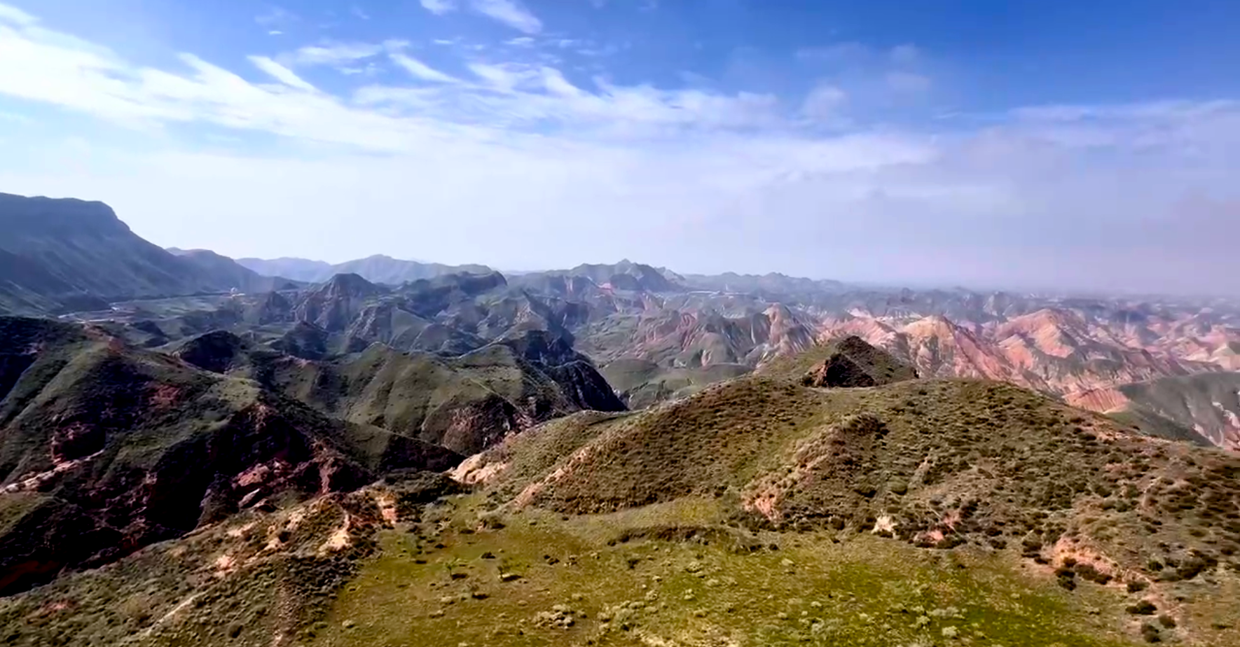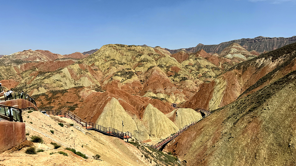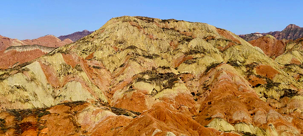 水墨丹霞,神工造物。乾坤兮屹屹,云天阔。层峦叠嶂,斑斓叫绝。幽远莫测,烟波披拂! 霁日光风,骋怀激越。逸情安可忽?莫停歇!丝绸古道,生机勃勃。永登极目,本心欢悦。