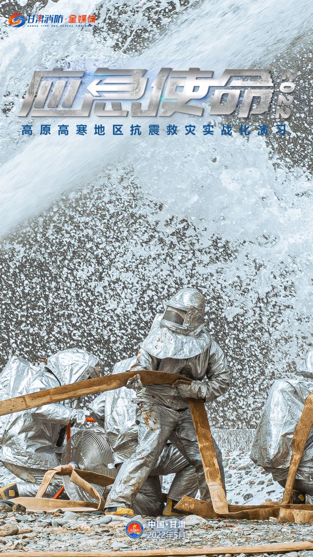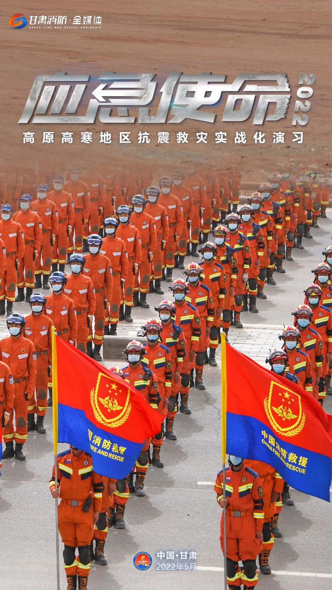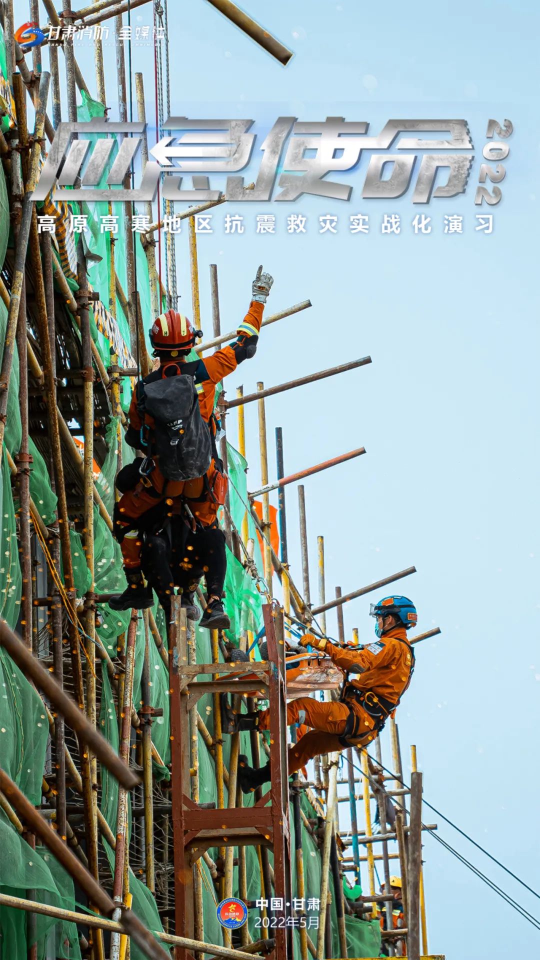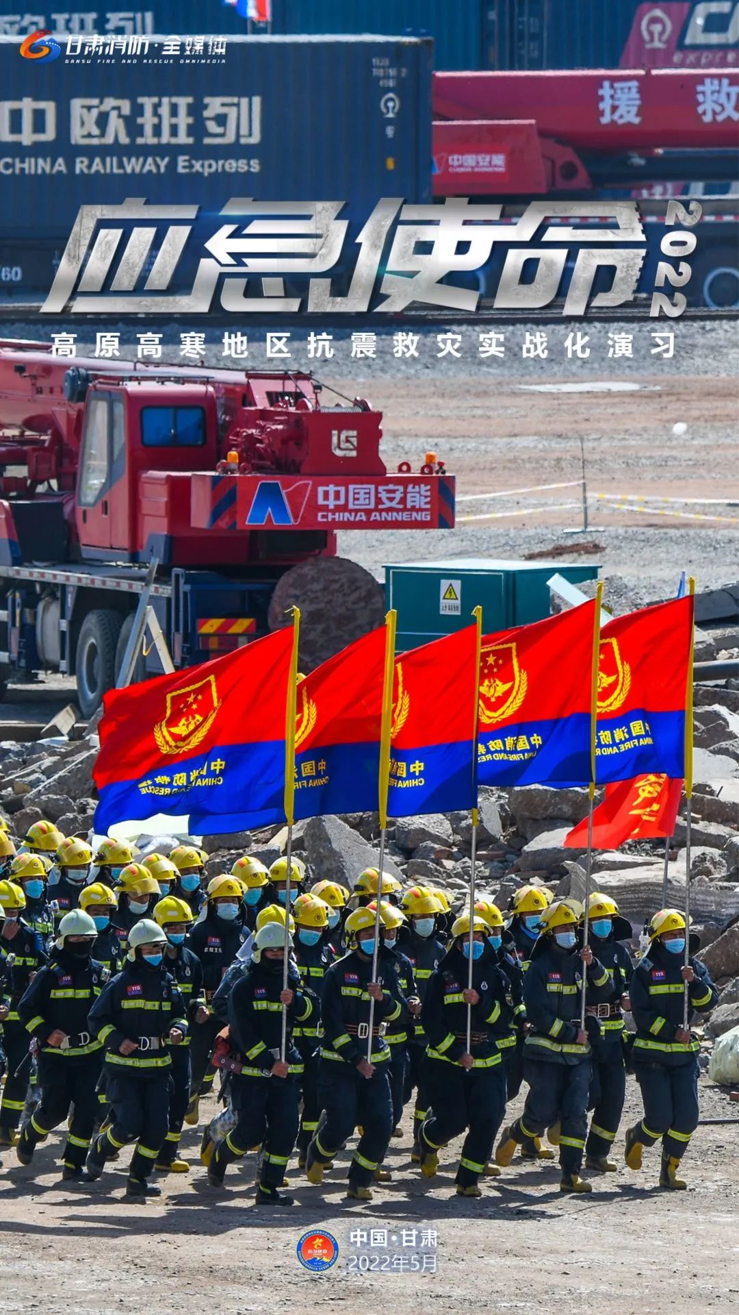5月11日上午,国务院抗震救灾指挥部办公室、应急管理部、甘肃省人民政府在甘肃省张掖市等地联合举行“应急使命·2022”高原高寒地区抗震救灾实战化演习。(甘肃消防)