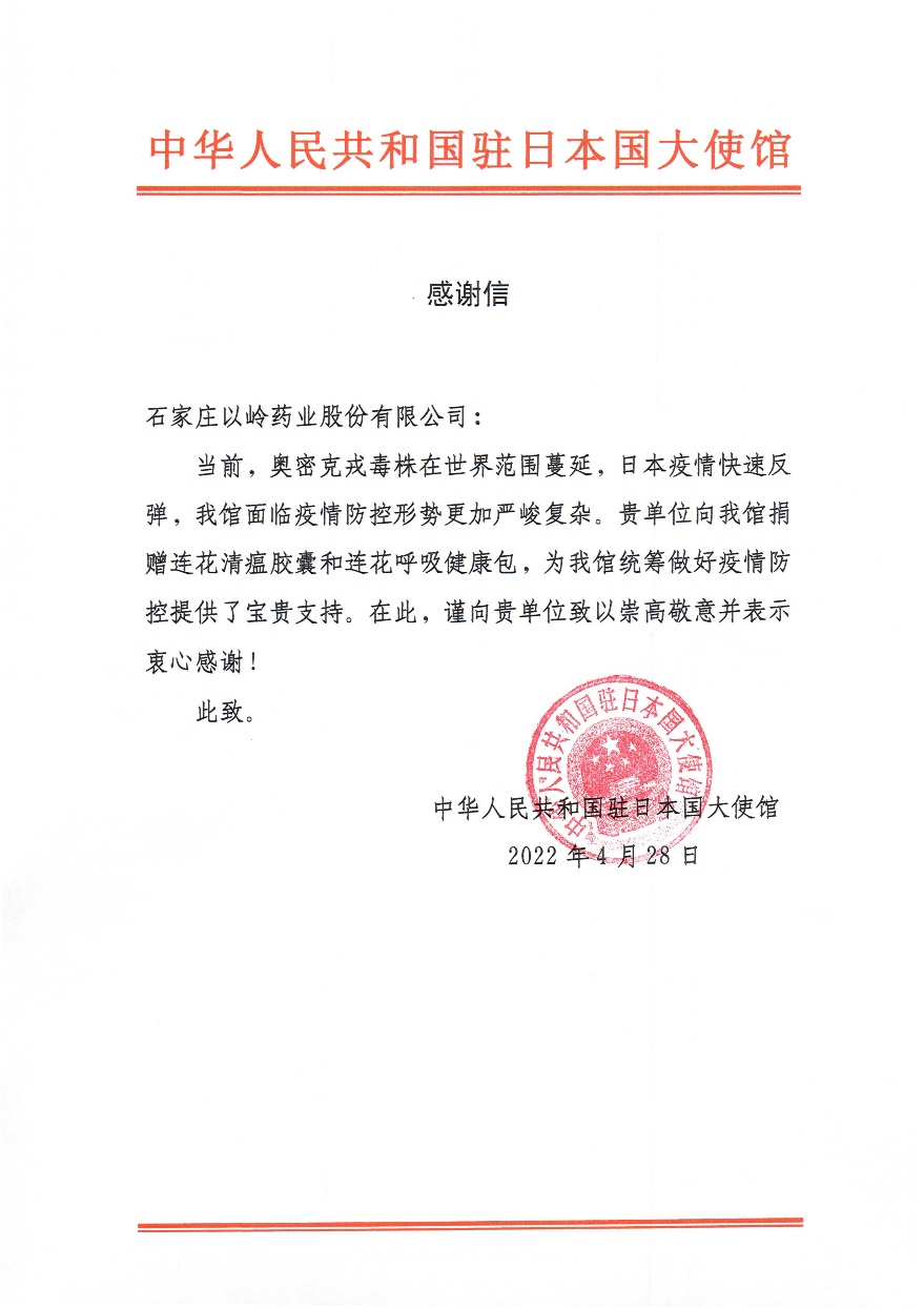“贵单位向我馆捐赠连花清瘟胶囊和连花呼吸健康包,为我馆统筹做好疫情防控提供了宝贵支持。在此,谨向贵单位致以崇高敬意并表示衷心感谢!”在一封4月28日发出的感谢信中,中国驻日本大使馆向以岭药业表示了诚挚谢意。