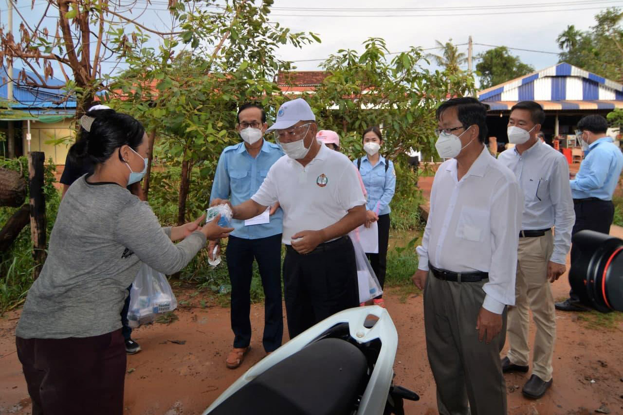 (资料)2021年9月,柬埔寨卫生部长蒙文兴(左三)向暹粒省新冠肺炎高风险区的居民派发连花清瘟胶囊。(图片:FreshNews)