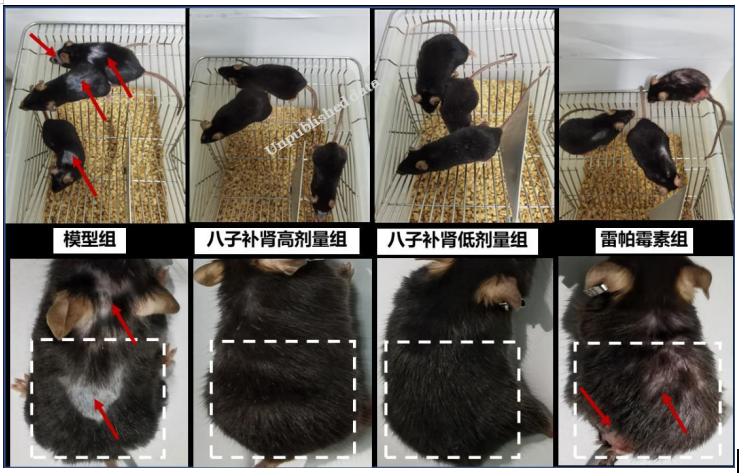脱发和须发变白是最明显的衰老表现。此前有研究显示雷帕霉素有抗衰老作用,最新实验将八子补肾胶囊与雷帕霉素对比研究显示,对13月龄(约相当于人的52岁)小鼠给予八子补肾或者雷帕霉素,2个月后(15月龄,约相当于人的55周岁),模型组小鼠脱毛、毛发变白现象明显,精神状态不佳,活动减少;雷帕霉素组小鼠也有不同程度脱毛,且毛色的光泽较差;八子补肾组小鼠皮毛黑亮浓密,精神状态良好,活动正常,显示出八子补肾胶囊具有良好的抗衰老作用。