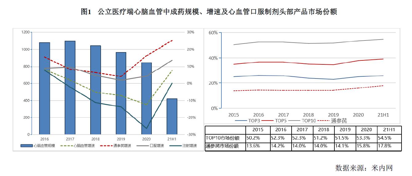 年报显示,2021年以岭药业心脑血管三大产品通心络胶囊、参松养心胶囊、芪苈强心胶囊合计实现销售收入45.34亿元,占营业收入的44.82%,克服疫情等不利因素的影响,逆势实现31.56%的增长。米内网数据显示,该三大创新专利中药公立医疗端市场份额由2015年的13.6%提升至2021年上半年的17.8%。