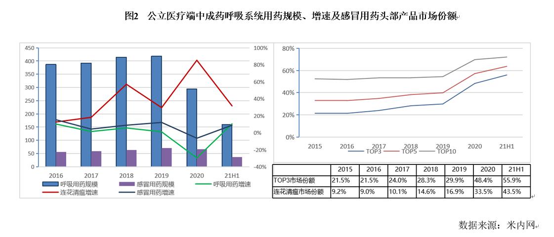 2021年,连花清瘟产品实现销售收入41.08亿元。米内网数据显示,从公立医疗端表现看,中成药感冒用药市场集中度显著提升,TOP3产品市场份额由2015年的21.5%提升至2021上半年的55.9%,以岭药业连花清瘟占据市场绝对优势,在2021上半年公立医疗市场中成药感冒用药销售排名位居第一。