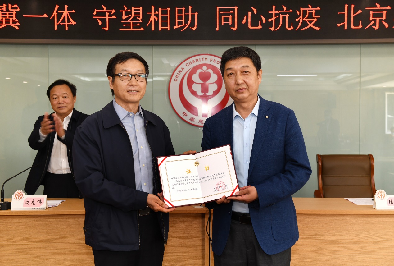 企业代表向中华慈善总会秘书长边志伟(左)递交捐赠牌。(李济慈摄)