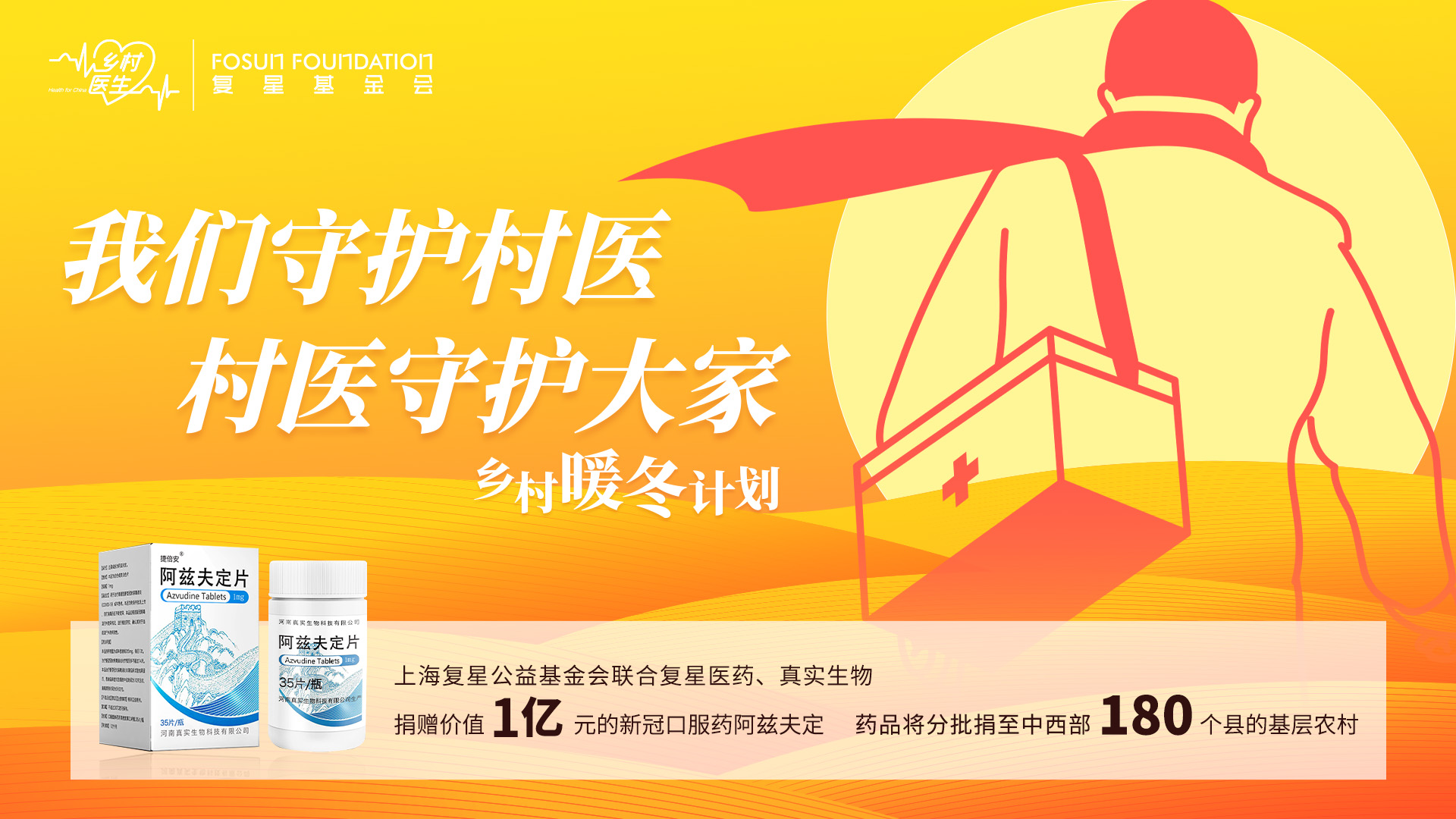 2023年1月9日,上海复星公益基金会(以下简称“复星基金会”)联合复星医药、真实生物启动“乡村暖冬计划”,向中西部农村地区以及养老院、福利院等捐赠1亿元新冠抗病毒口服药阿兹夫定,并联合爱心企业和机构配捐爱心包,联合专家、院士开展面向村医的线上新冠诊疗培训课程,助力农村地区平稳度过这个“暖”冬。
