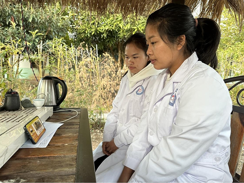 云南省澜沧县岩因村钟丽萍医生与同事收看“乡村暖冬计划”村医新冠防治培训直播