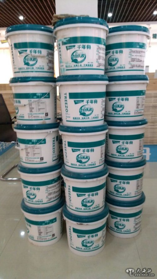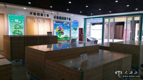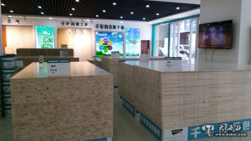 在大厅的中间区位,码放整齐的千年舟生态板材,天花板的灯光打在上面,给人一种整洁、平滑的美感,站在不同角度,有关千年舟板材的材质、棱角和纹路清晰可见,在接地的四周绕贴着由“千年舟LOGO、千年舟绿色板材、千年舟儿童房专用板”字眼的品牌条幅,蓝底白字的设计给人一种别样的舒爽。