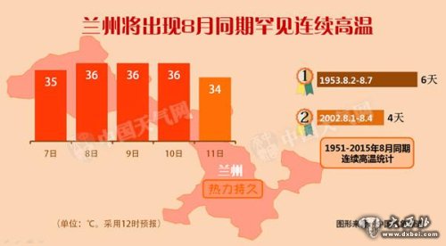 大西北网讯 记者王占东 今日立秋,但兰州天气依然高温依旧。而从兰州市气象台今日下午发布的未来一周预报看,这种炎热高温天气将会持续,局地最高温可达37℃以上。据1951年至2015年兰州气象记录显示,在8月份同期连续高温统计中,连续日数最多的为6天,其次为4天。从目前预报来看,此次兰州高温过程有可能直逼1951年以来的第二名。