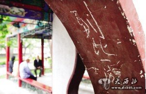 记者仔细观察,在假山上刻字,需要用地上有棱有角的小石子才行,而往亭子上刻字则更容易些,由于亭子为木质,因此钥匙、小刀甚至笔尖都可以随意在上面刻画。一群经常在长廊内锻炼的老人告诉记者,这些刻字划印已经存在很长一段时间了,与公园的环境十分不符,并且影响了公园的整体美观。“这都是用小刀刻上去的,根本没法修复,木质材料在表面多刷几层油漆还能勉强遮掩遮掩,可是被刻上字的假山总不能刷漆吧,对于这种随意破坏公共场所东西的人来说,即便搬走了假山,他们也还得找别的地方乱刻!”