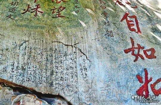 摩崖石刻:有人用蓝色记号笔装古人题词本报记者 江洋 摄