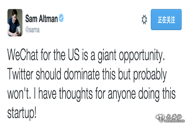 “对于美国,微信将是一个巨大的机会。Twitter 本能主导这件事但它们很可能不行了。你们任何人想做此类创业公司,我有一些想法!”