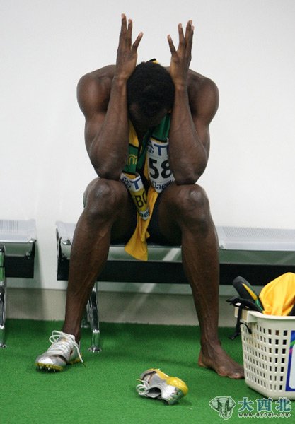 2011年8月28日,牙买加选手博尔特在被罚下后神情沮丧。当日,在大邱2011世界田径锦标赛男子100